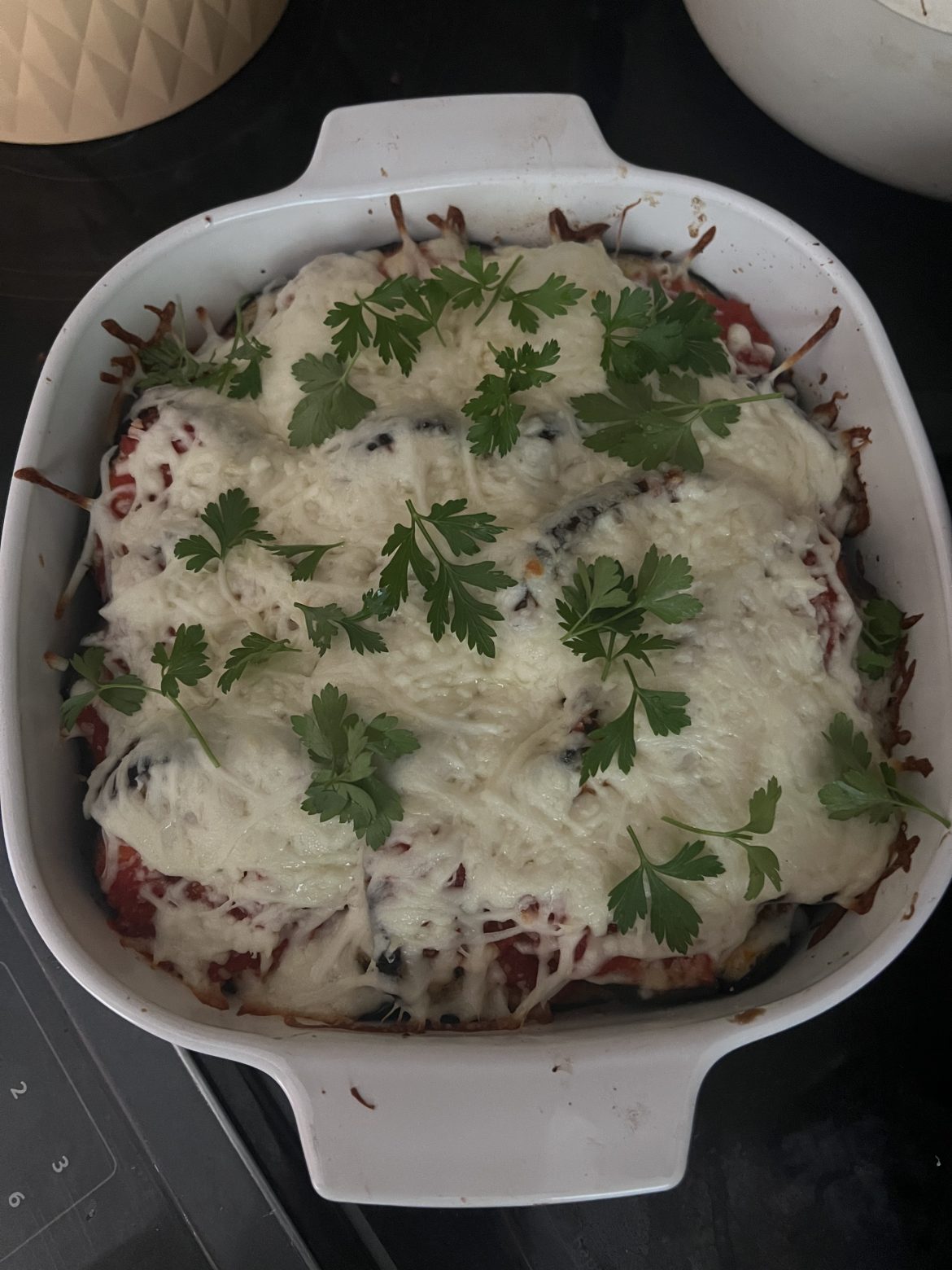 Then layer the ground beef. Cover with another layer of eggplants, then a layer of sauce again. Finish it with mozzarella and put into the oven for about 20 mins at 375F.
