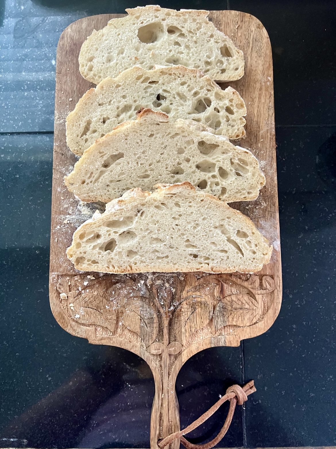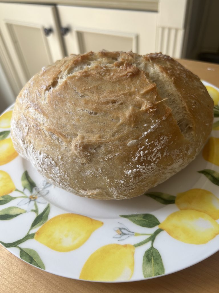 More recently I have been making it frequently. It’s a very simple and pretty quick no mess recipe to please your guests. It tastes like store bought sourdough bread to me. But of course the real sourdough will be even better – a post on that is coming up shortly. I have just begun my starter, so will post on that in a week or two.